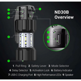 Quatre modes programmables s'adaptent à divers scénarios, des signaux d'attention rapides aux effets dissuasifs soutenus. Construit en aluminium de qualité aventure et résistant à l'eau IPX7, le ND30B offre des performances fiables, que vous effectuiez des exercices d'entraînement ou que vous ayez besoin de signaler une demande d'aide dans des endroits éloignés.
