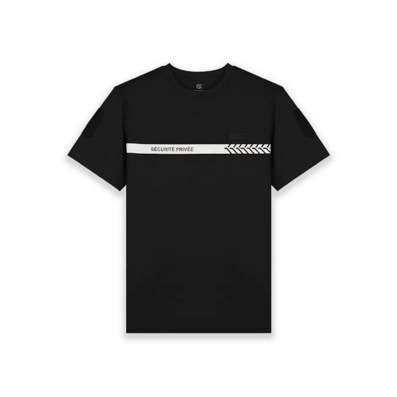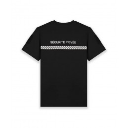 Ce T-shirt noir arbore une bande grise avec l'inscription « SÉCURITÉ PRIVÉE » sur la poitrine et un marquage rétroréfléchissant au dos, assurant une visibilité optimale.
